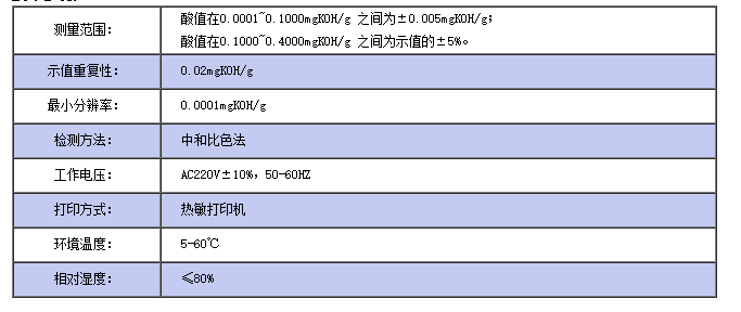 0.00010.100mgKOH/g之間為±0.0005mgKOH/g;酸值在0.1000.40